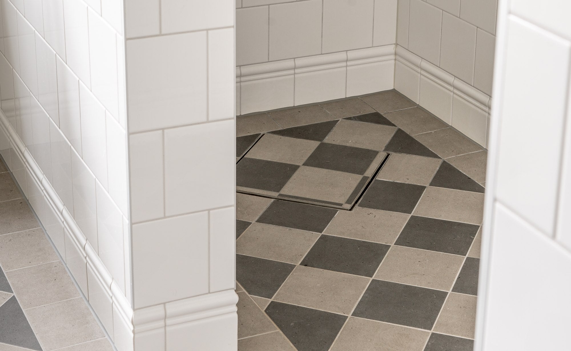 – I duschen skapade vi ett rutigt golv i tegelrött och ljusbeige med klinker från serien Global Collection. Det är otroligt fina plattor! Jag är så nöjd. Hade jag vetat hur lättskötta de är hade jag nog valt rutmönster i hela tvättstugan och groventrén, säger Malin.