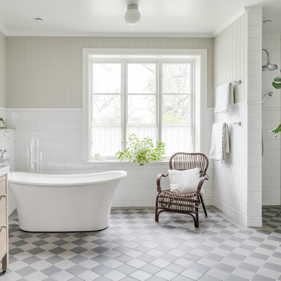 – Jag velade ganska länge angående det rutiga badrumsgolvet. Jag hade sett inspirationsbilder med golv där man lagt olika nyanser av kalkstensplattor i rutmönster. Eftersom jag hade tagit hem prover på Stones i alla tre färger så provade jag att lägga plattorna i ett diagonalt rutmönster och vår plattsättare hjälpte till att bolla idéer. Det var ganska svår att ta ett så djärvt beslut, men jag är så glad att jag vågade! Det kändes rätt i magen när jag tittade på hur golvet tog form och växte fram.