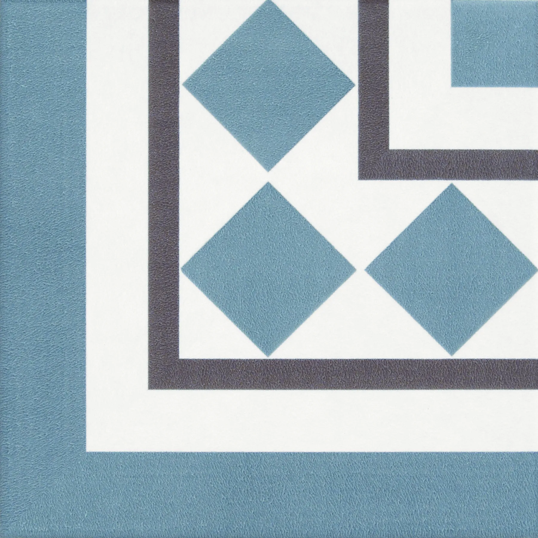 En vacker kantdekor (hörn) i blått med marockanska influenser. Plattorna är frostsäkra och har en slät och lättskött yta. I serien Kerion ingår en mängd olika mönster i dämpade toner vilket ger möjlighet att skapa vackra och personliga ytor. Plattorna är frostsäkra och går att använda på golv och vägg, inomhus som utomhus på t.ex. balkongen, altanen eller i växthuset. En serie som är lika rätt i det moderna hemmet som i det lantliga och rustika! Komplettera gärna med dekorplattan och bården i samma färg.