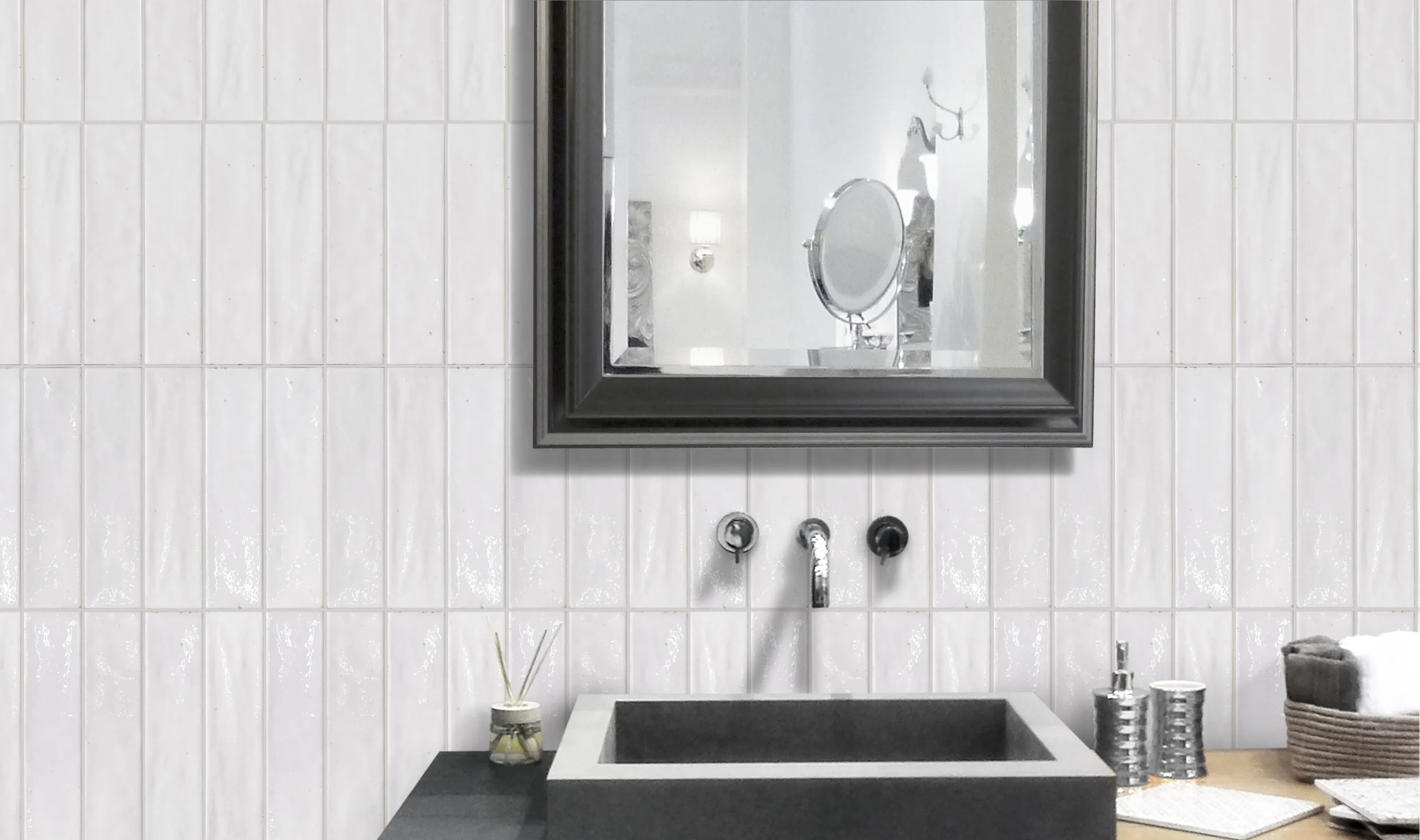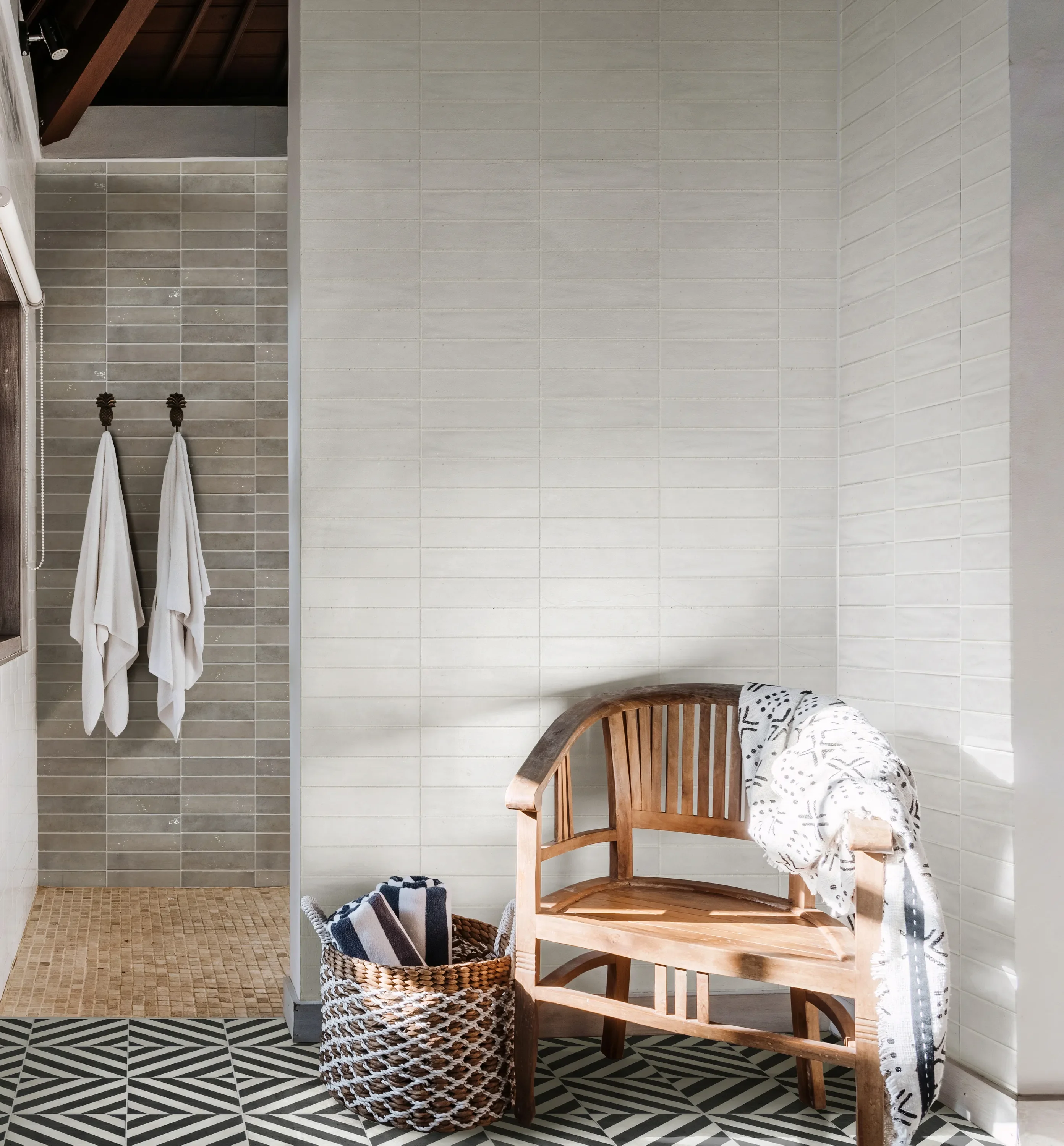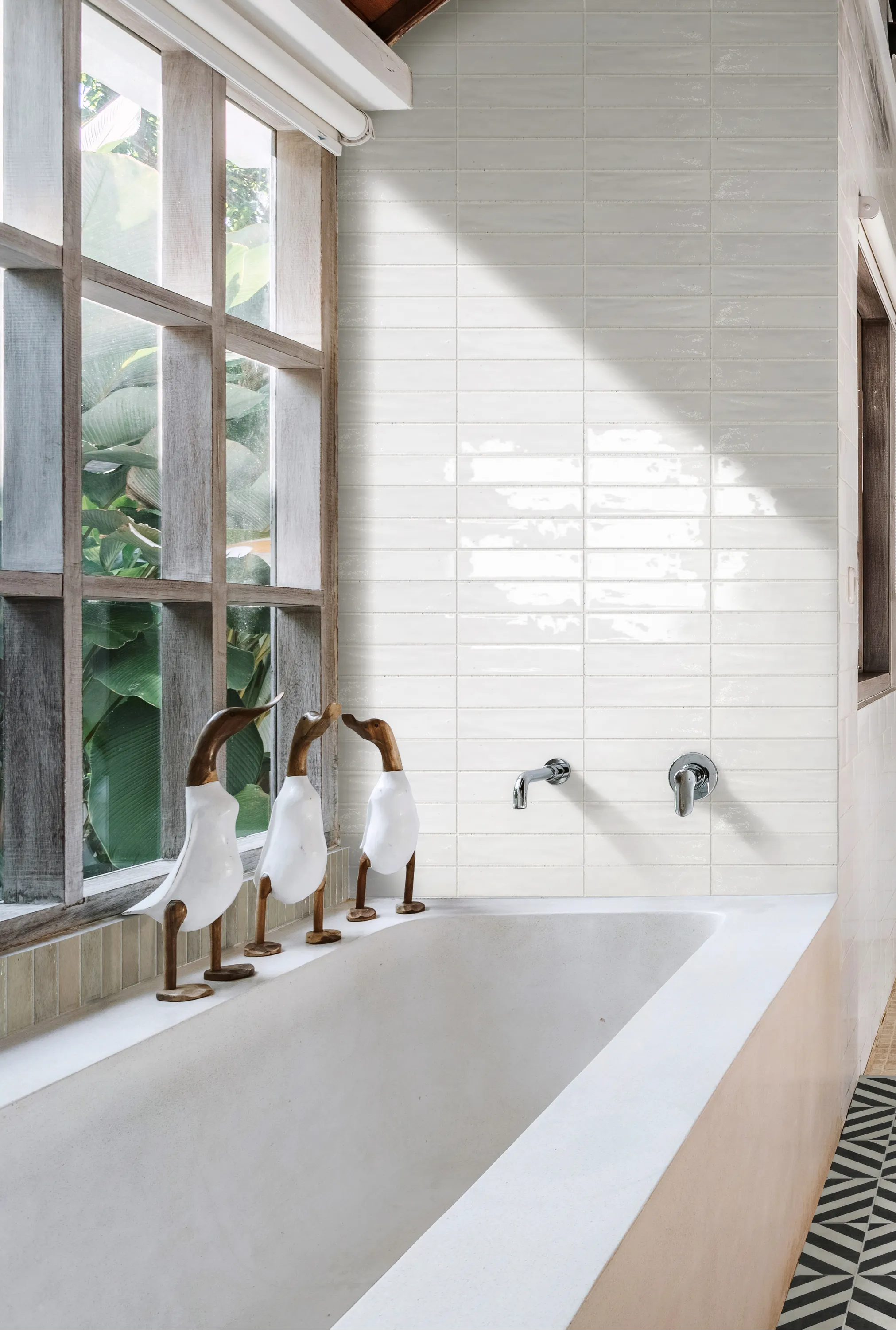 Vit glaserad klinker med en rustik och handgjord känsla. Ytan är oregelbunden och färgen skiftar i intensitet och nyans. Det långsmala formatet, 6x25 cm, öppnar upp för att skapa kreativa mönster och du kan också mixa olika kulörer från serien för att skapa effekter.