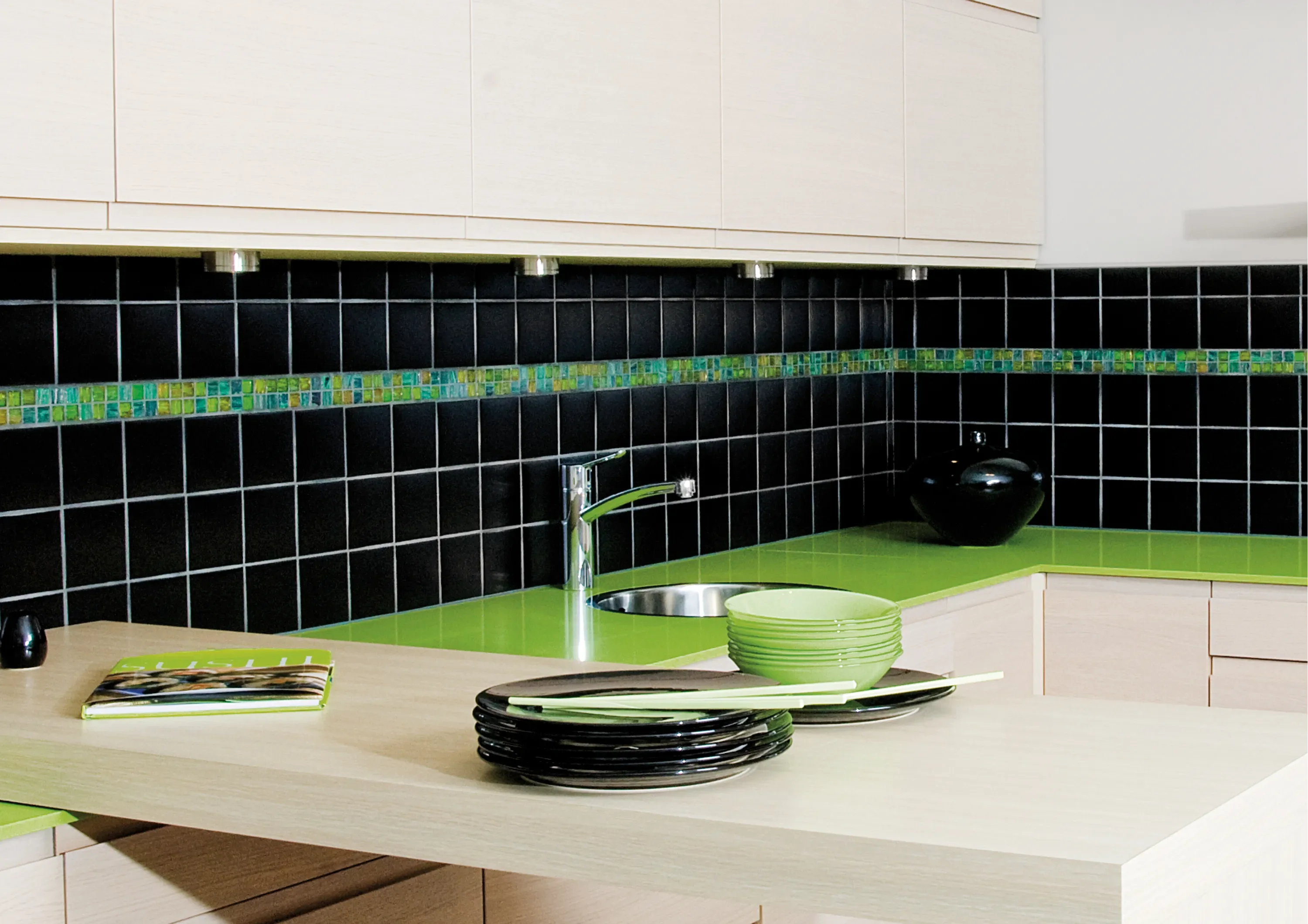 Grön, lyxig glasmosaik med blank yta. Färgnyansen skiftar effektfullt från mosaik till mosaik. Bisazza har en fantastisk lyster och finns i många olika färger.