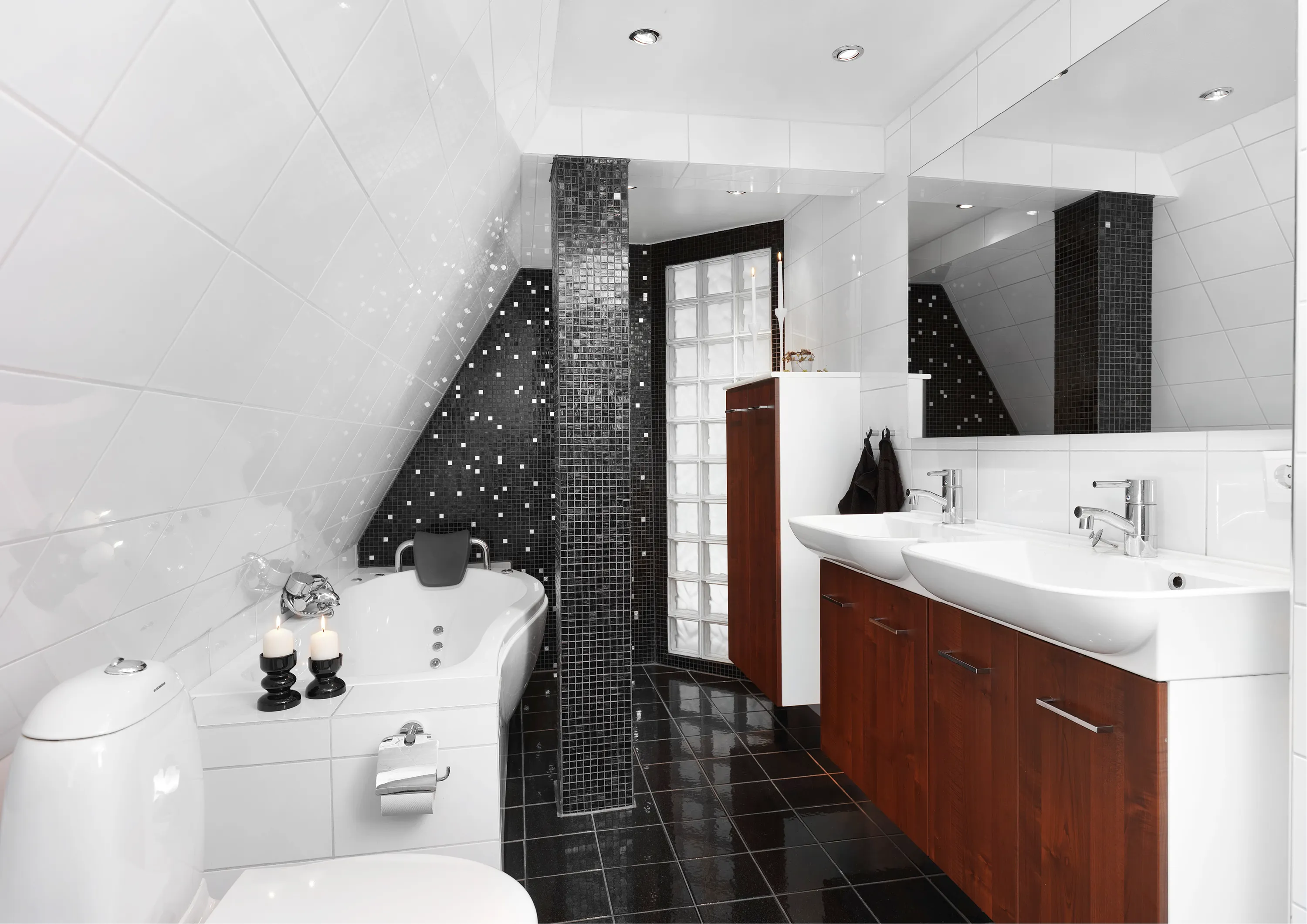 Svart, lyxig glasmosaik med blank yta. Färgnyansen skiftar effektfullt från mosaik till mosaik. Bisazza har en fantastisk lyster och finns i många olika färger.