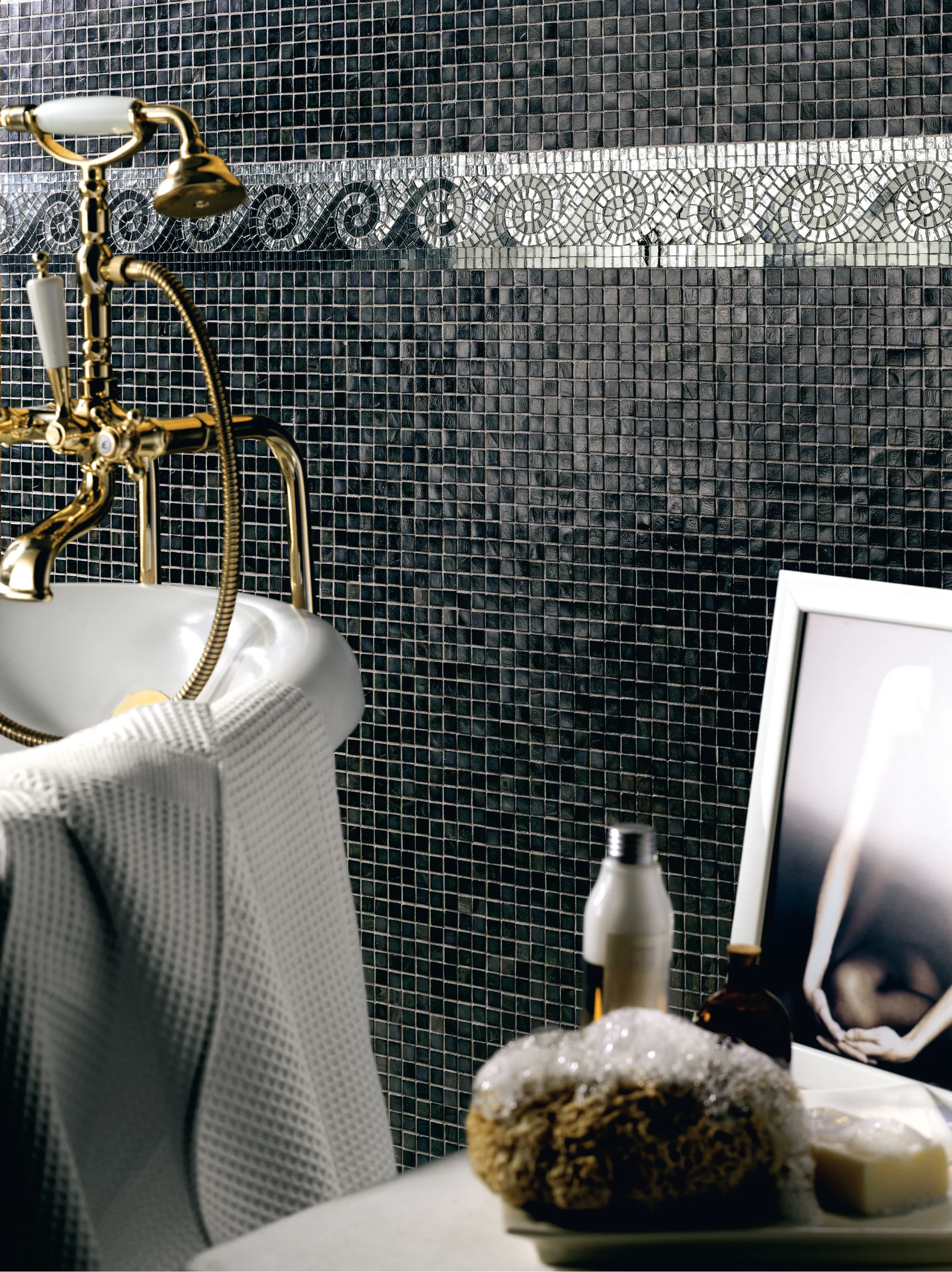 Svart glasmosaik som har en handgjord känsla. Ytan är blank och färgen skiftar från mosaikbit till mosaikbit vilket ger en vacker effekt. Klä hela väggarna i badrummet, använd som stänkskydd i köket eller skapa effekter på utvalda ytor. Sicis finns i regnbågens alla färger och går med fördel att blanda för att skapa en unik inredning.