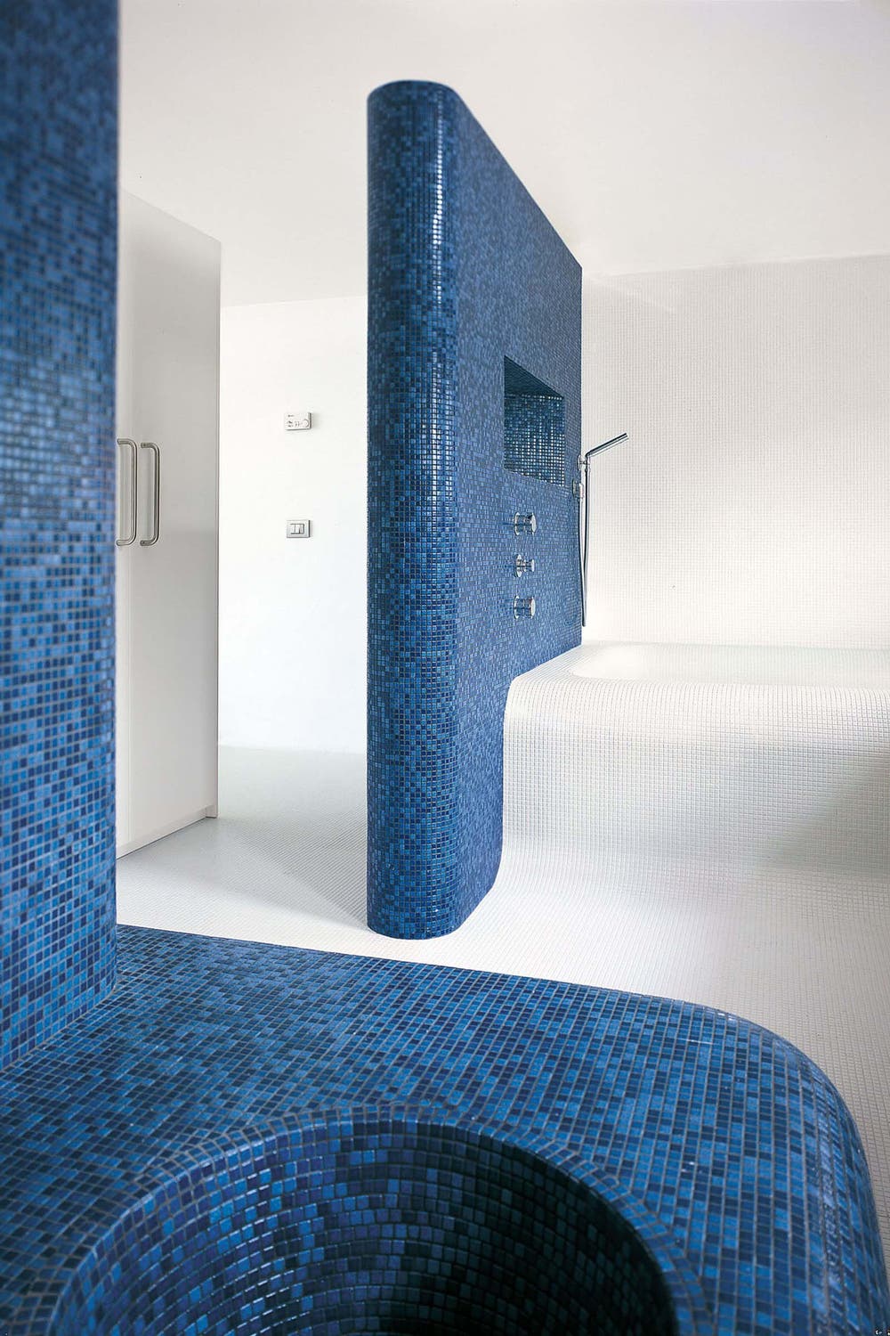 Mixad mosaik i keramik med mosaikbitar i olika blå nyanser. Kanterna är mjuka och aningen rundade. Denna mosaik lämpar sig för såväl privata som offentliga utrymmen, i till exempel kök, badrum, pool, spa, hotell och restaurang. Du kan exempelvis använda mosaik på en utvald del i badrummet, t.ex. i duschen eller klä in badkaret.