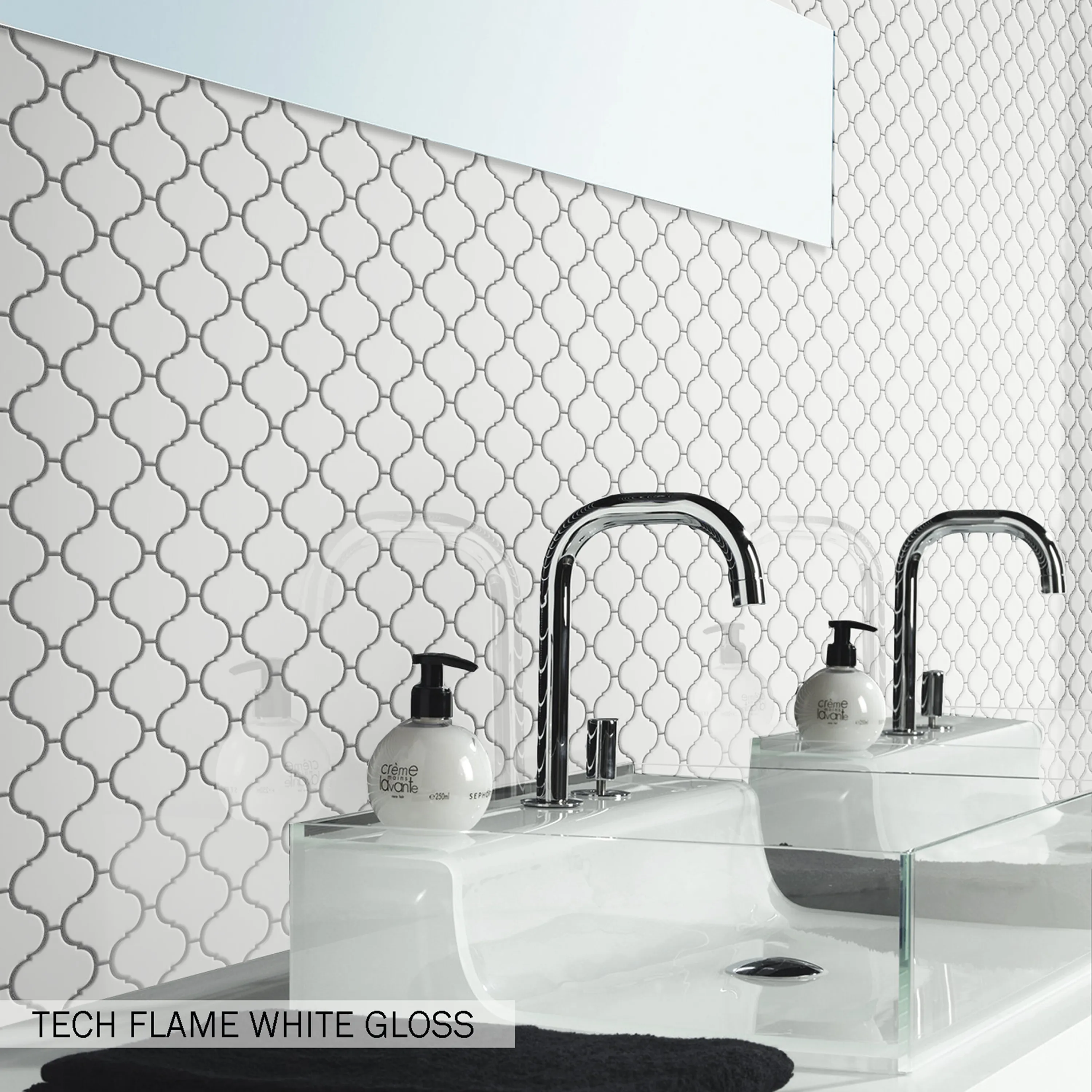 Tech Flame är en mosaik bestående av vita blanka plattor i formatet arabesque. Mosaiken kommer på nät och går att sätta på golv och vägg inomhus. Perfekt som en snygg detalj exempelvis i en nisch i badrummet eller i köket. Framhäv mönstret genom att välja en mörkare fog eller välj en ljus fog för ett softare intryck.