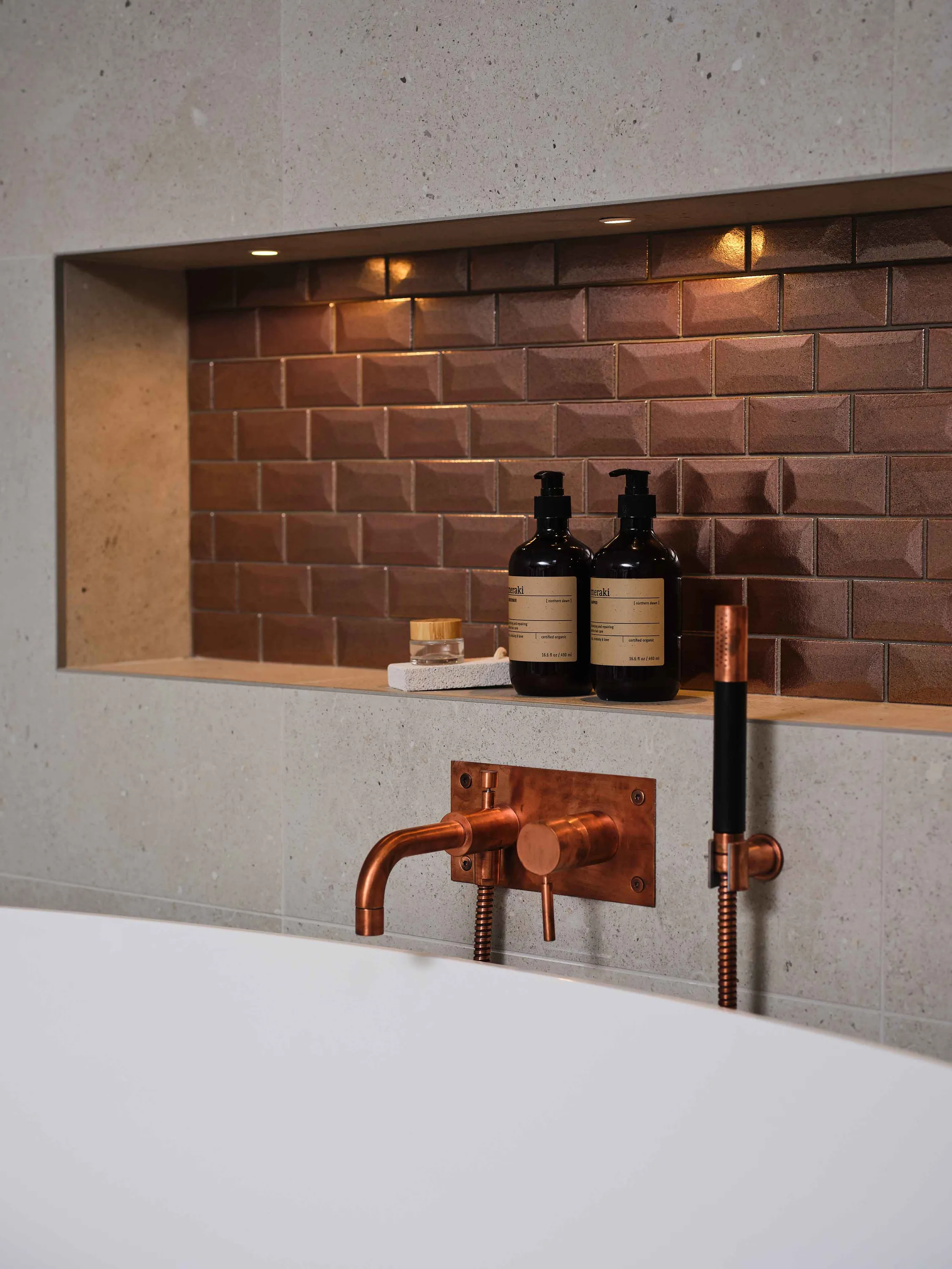 Modernt ”metrokakel” i kopparfärg som utmärker sig i mängden genom sitt geometriska formspråk och lätt förskjutna sättning. När ljuset faller på kaklet uppstår dekorativa ljus- och skuggeffekter och den metalliska ytan ger en alldeles speciell lyster och elegans. Kaklet, som är anpassat för vägg, gör sig mycket fin i köket, vid matplatsen, i badrummet eller på toaletten. Du kan exempelvis kakla en hel vägg för att skapa en ombonad bistrokänsla i köket. Libra finns i flera färger.