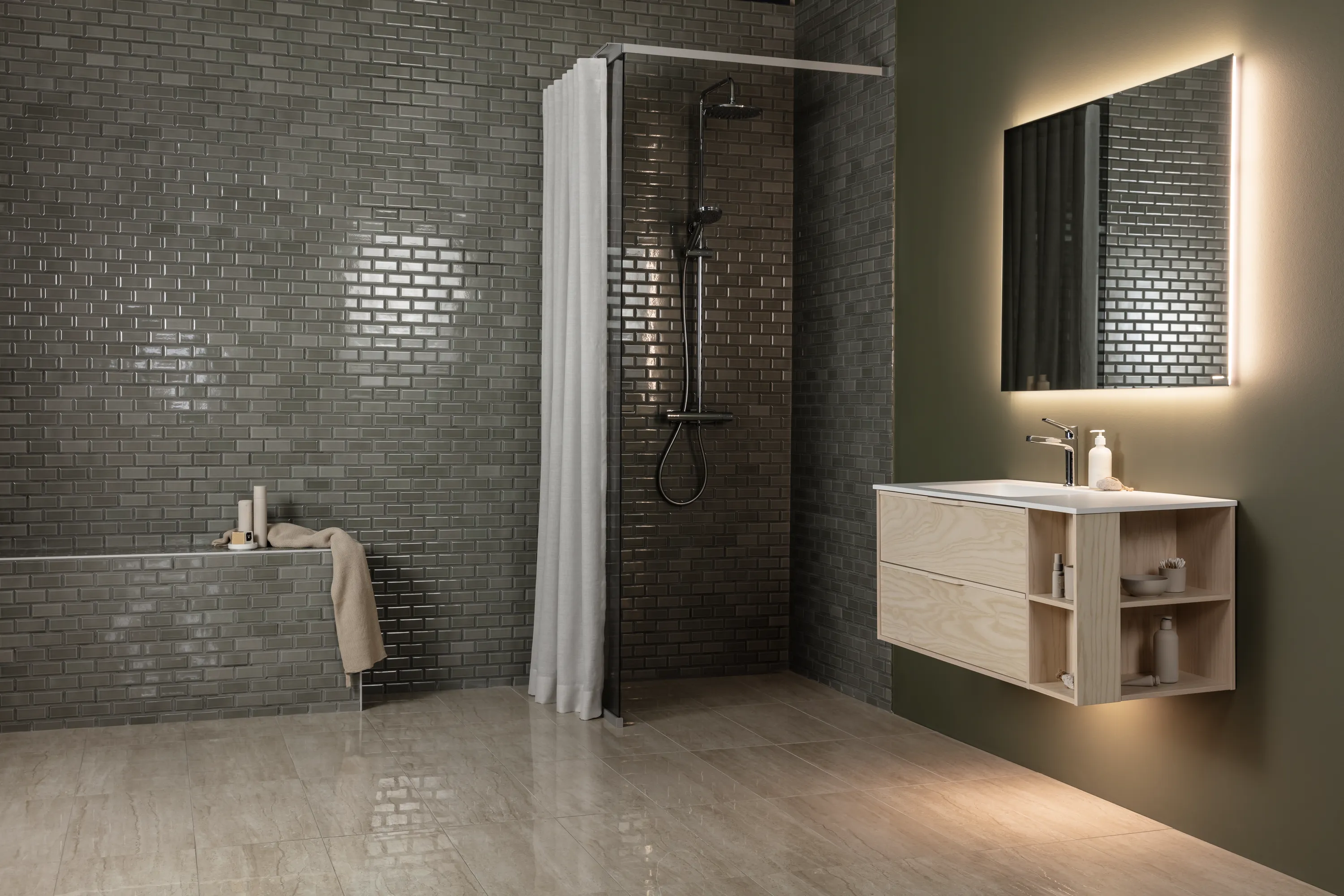 Grått ”metrokakel” som består av små fasade plattor monterade på nät. Ytan är blank och har en vacker lyster. Det unika formatet, 4,5x9,5 cm, ger denna klassiska variant av plattor ett nytt modernt uttryck. Formatet är perfekt för små utrymmen, som toalett, badrum eller som stänkskydd i kök. Kaklet kan givetvis också sättas på större ytor och ger då ett mer livligt intryck. Metro finns i flera färger.