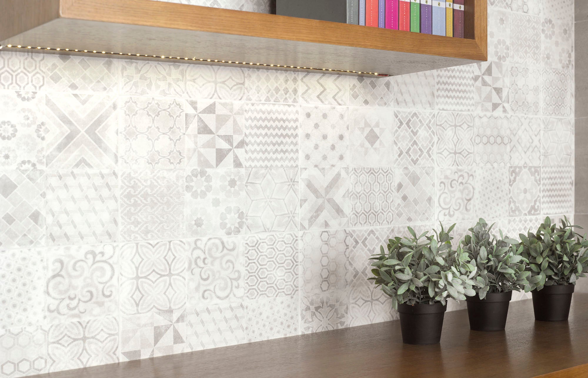 Mönstrade dekorplattor med cementliknande yta. Alpe passar för vägg inomhus, i exempelvis badrummet, tvättstugan eller som stänkskydd i köket. Kaklet säljs i hel förpackning om 9 plattor (1 m²) med mixade motiv.