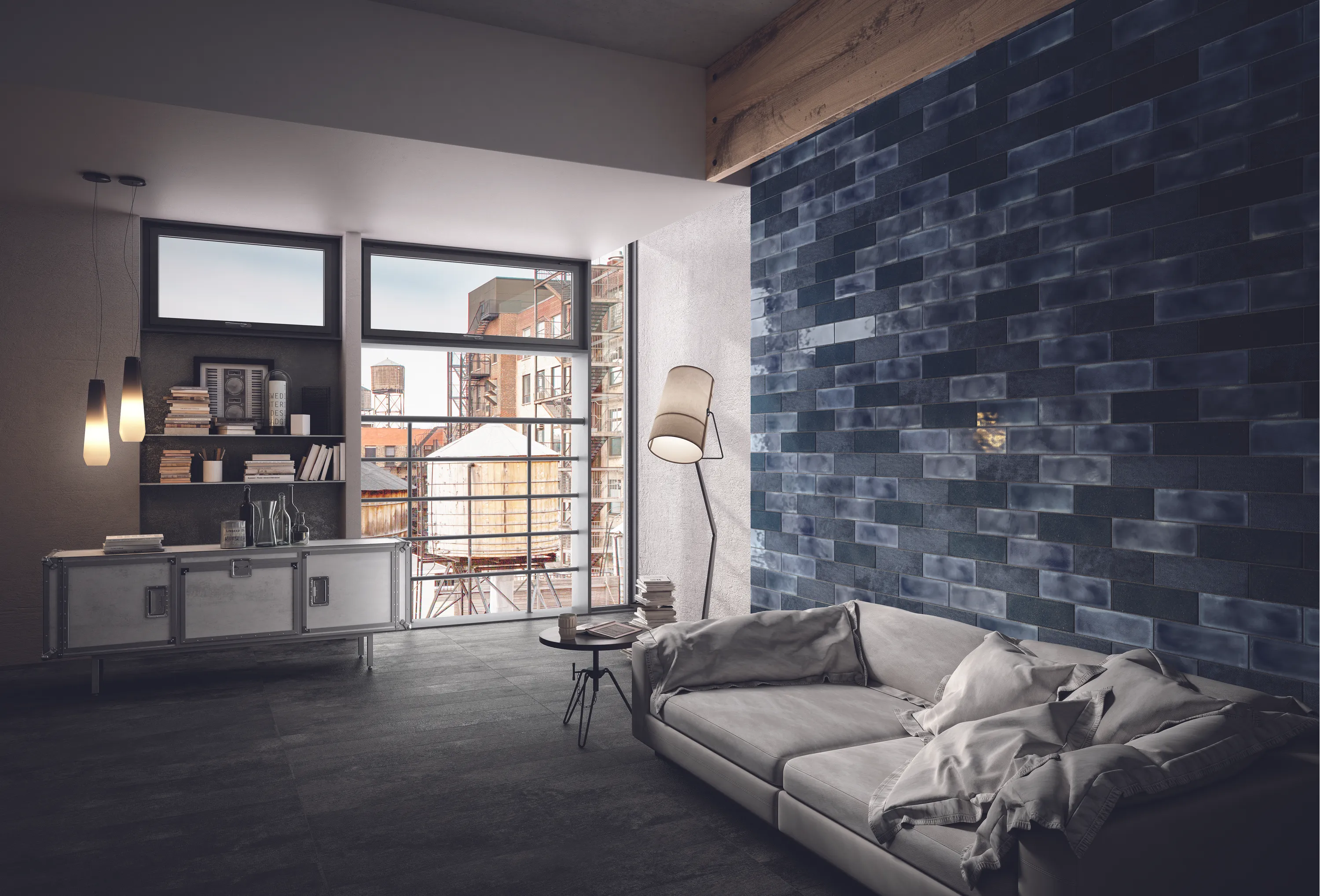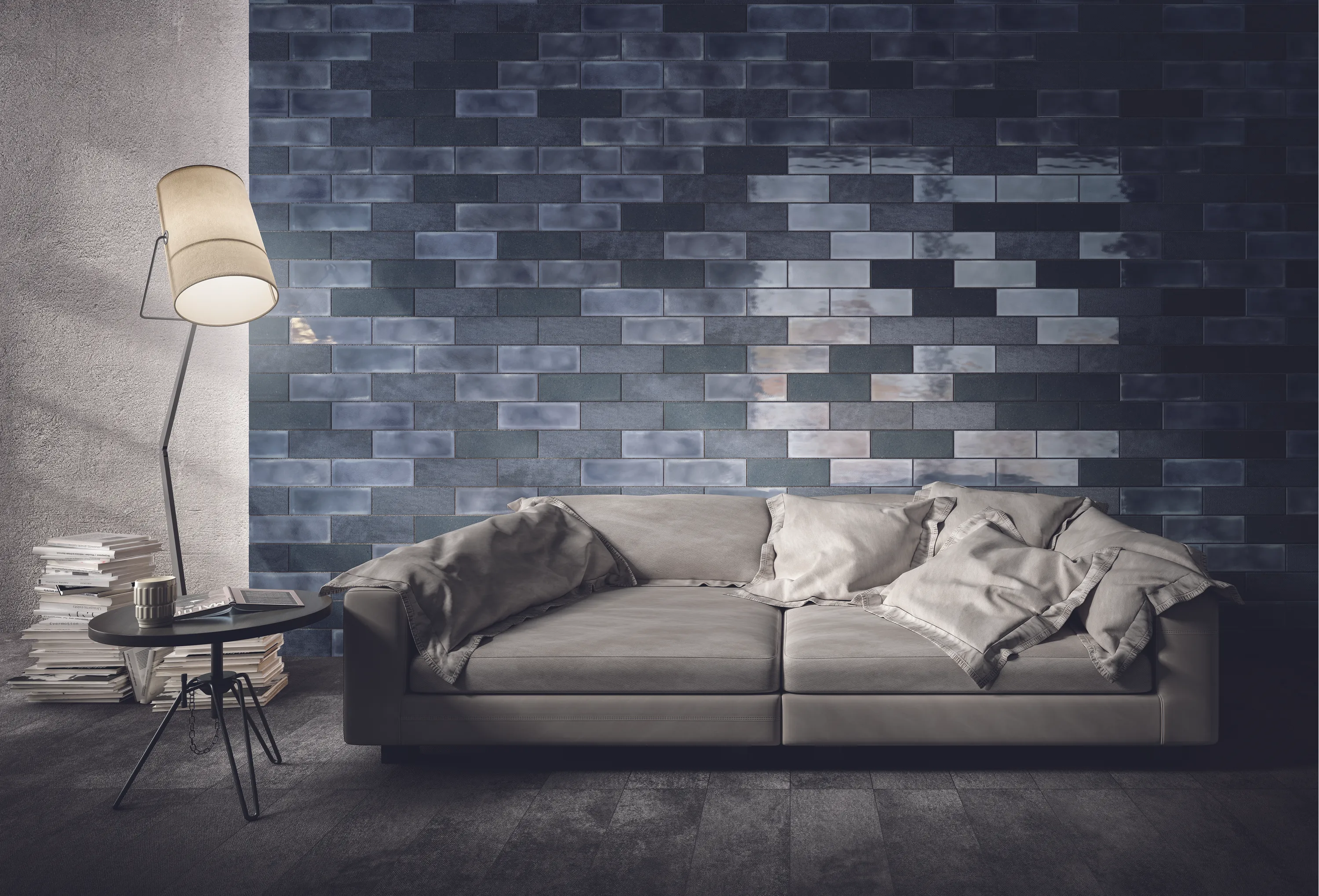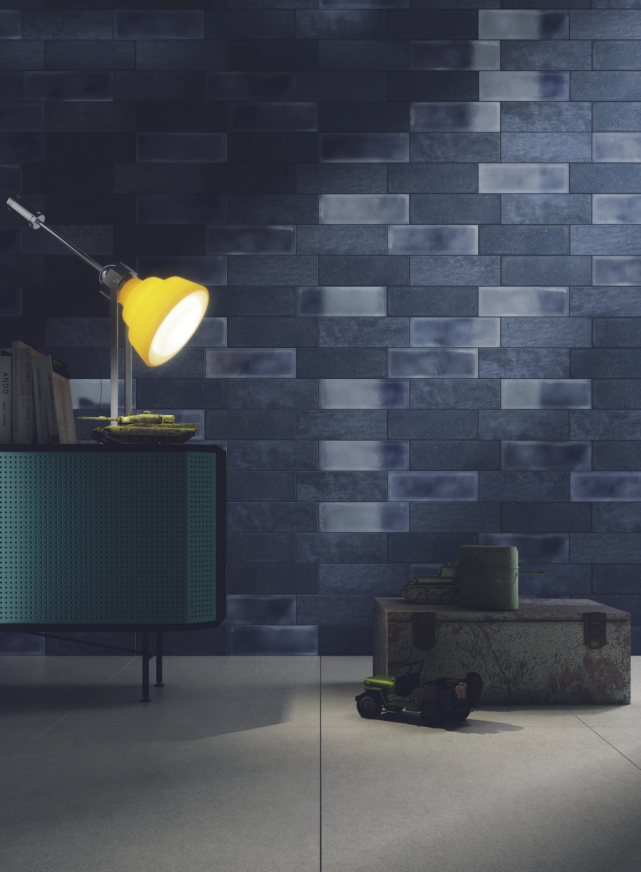 Blått, blankt kakel från varumärket Diesel. Ytan är blank och färgen något melerad. I serien Diesel Camp ingår fem dova ”militärtoner” som alla finns med tre olika texturer som gärna blandas för att skapa effektfulla kontraster. Passar på vägg i kök och badrum eller använd som en fondvägg i vardagsrummet.