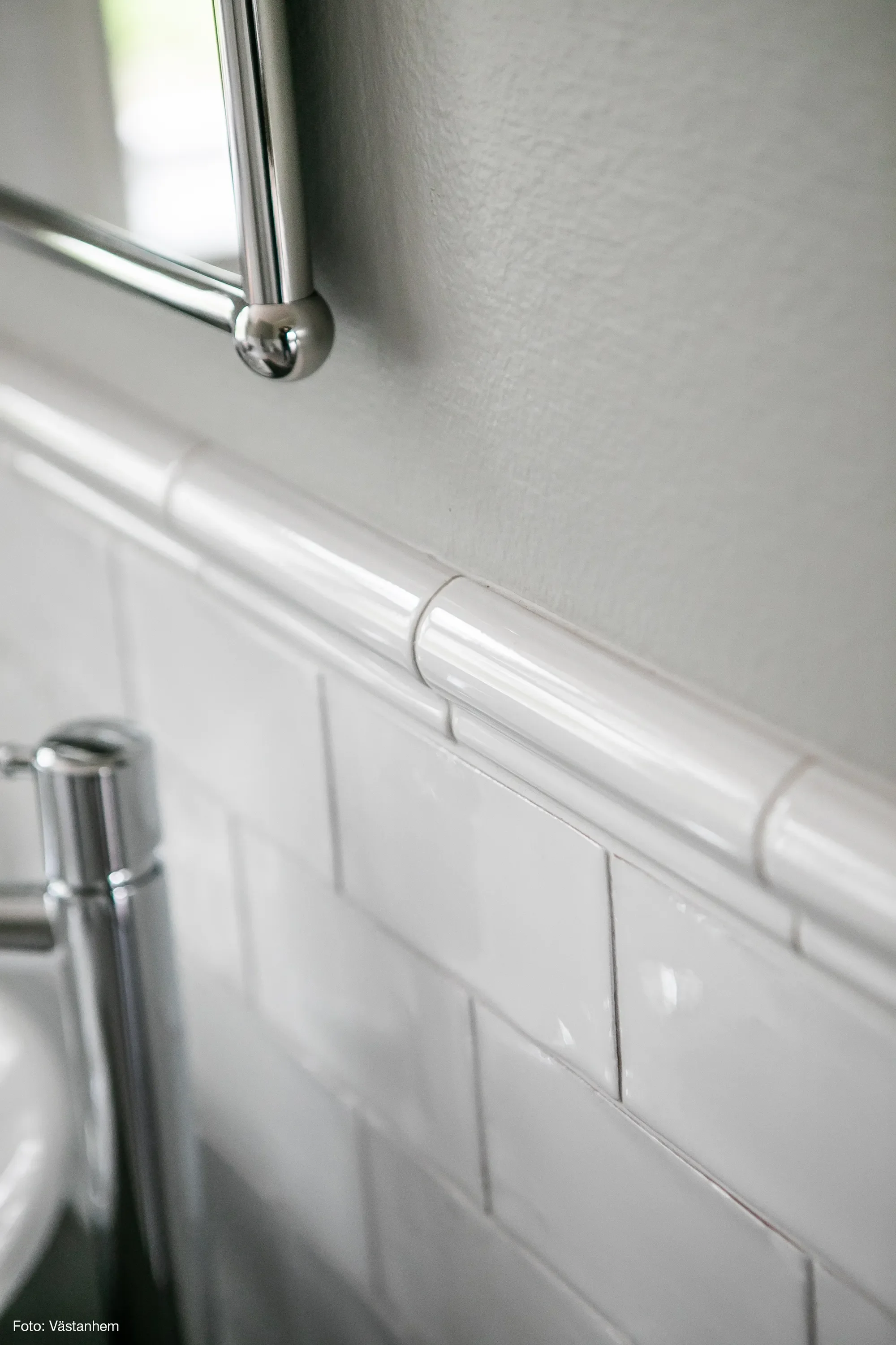 En vit blank bård som ingår i den klassiska och mycket eleganta serien Evolution. I serien ingår kakelplatta, bårder och sockel. Välj seriens alla delar för att skapa en elegant sekelskiftesstil. Ett tips är att kakla halva väggen för att sedan bryta av med en bård.