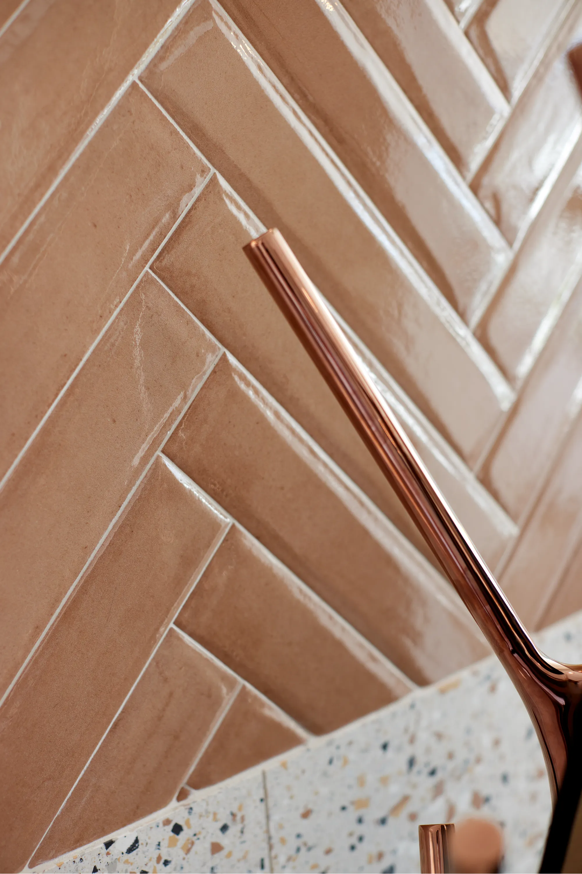 Blankt kakel i nyans av ljus terrakotta. Plattorna andas genuint hantverk – både vad gäller färg, form och yta. Vaga färgskiftningar i glasyren, den oregelbundna ytan och de mjuka kanterna ger en levande karaktär. Den trendiga pastellfärgen ger ett lugnt och elegant intryck. Tack vare det långsmala formatet ges möjlighet till flera olika kreativa kakelsättningar, exempelvis traditionellt liggande, stående, tegelsättning eller trendigt fiskbensmönster (herringbone). Frammenti finns i flera fina färger.