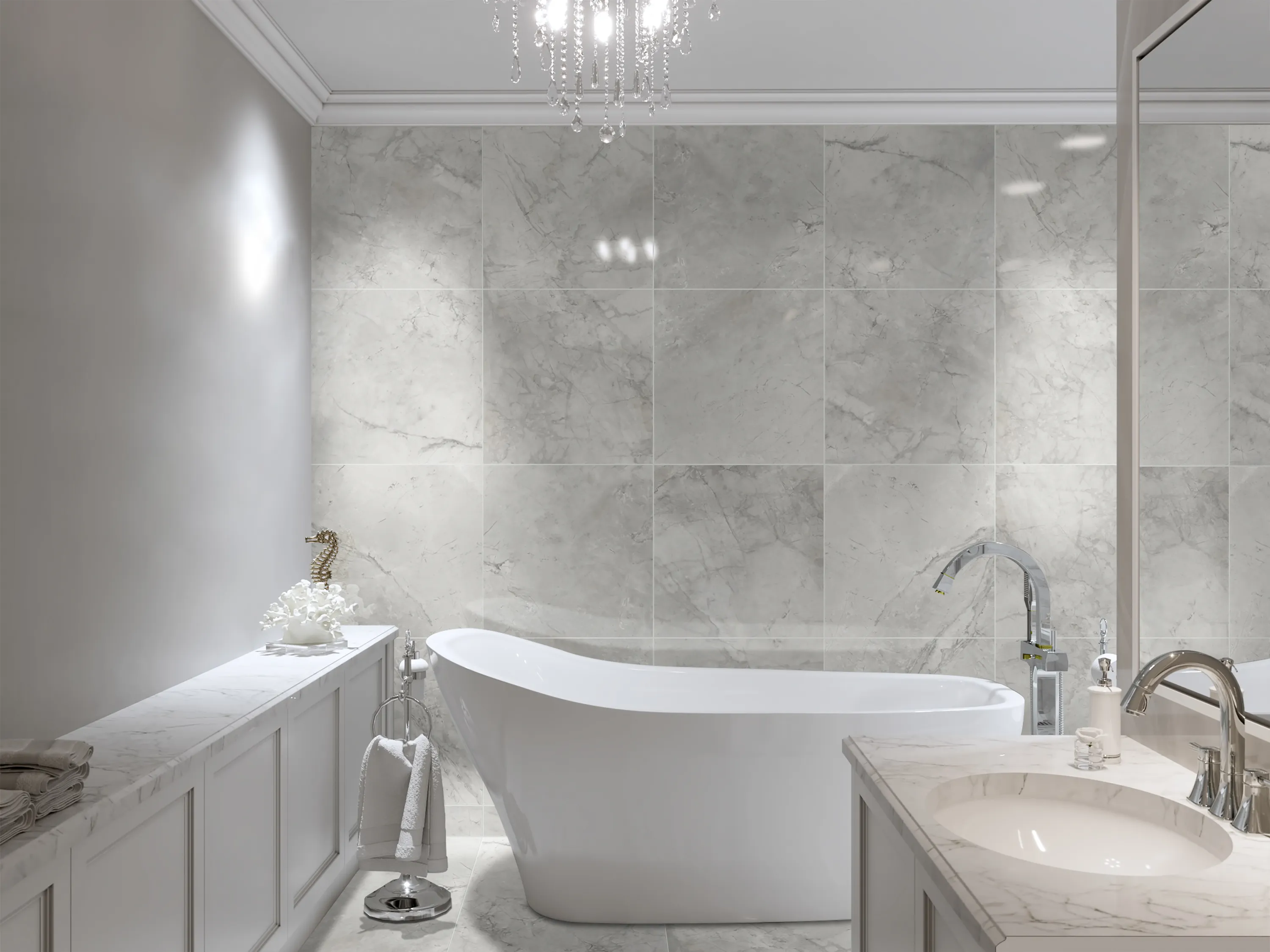 Tidlös, klassisk klinker med marmormönster. Boutique är en sofistikerad vit marmorimitation som med sin blanka yta och tunna ådring skapar en lyxig känsla i hemmet. Tack vare plattornas rektifierade kanter kan den sättas med minimal fog – för ett sobert helhetsintryck på golv som på vägg, exempelvis i badrum, kök och vardagsrum.