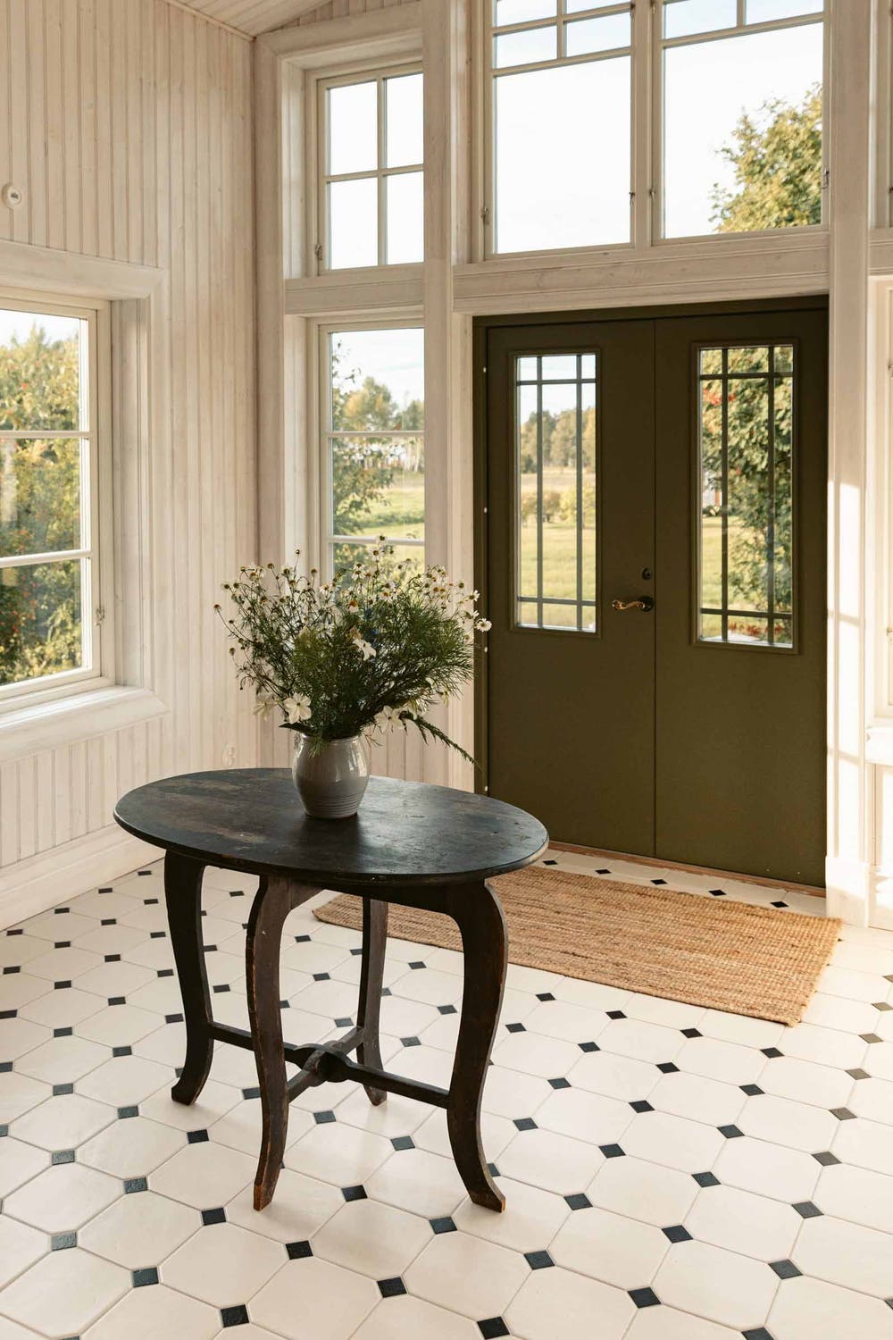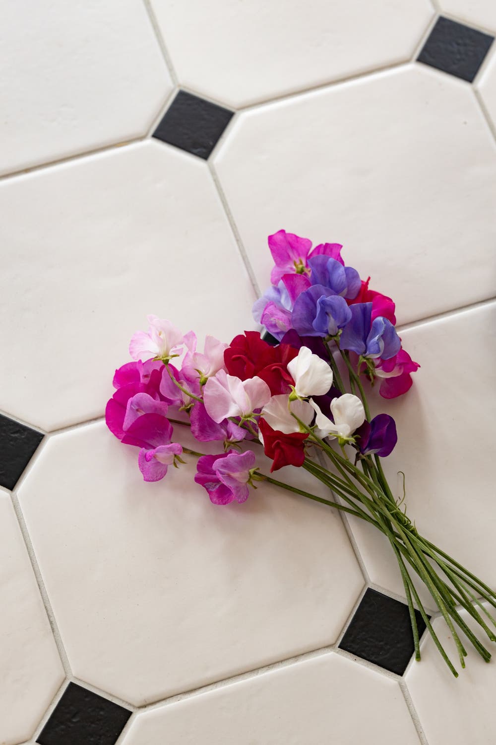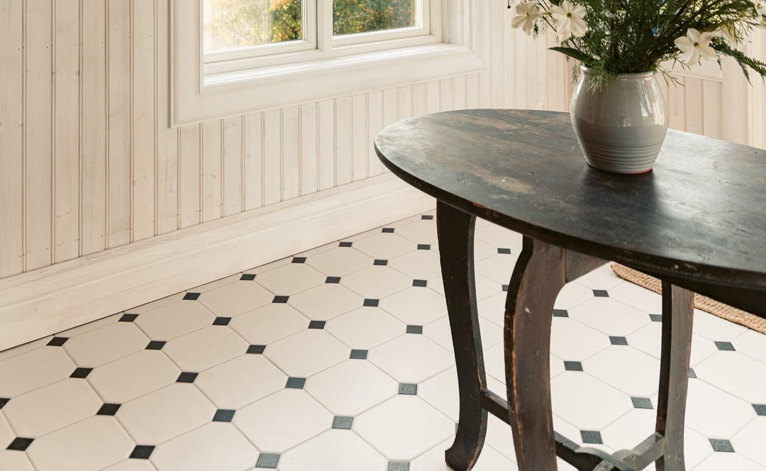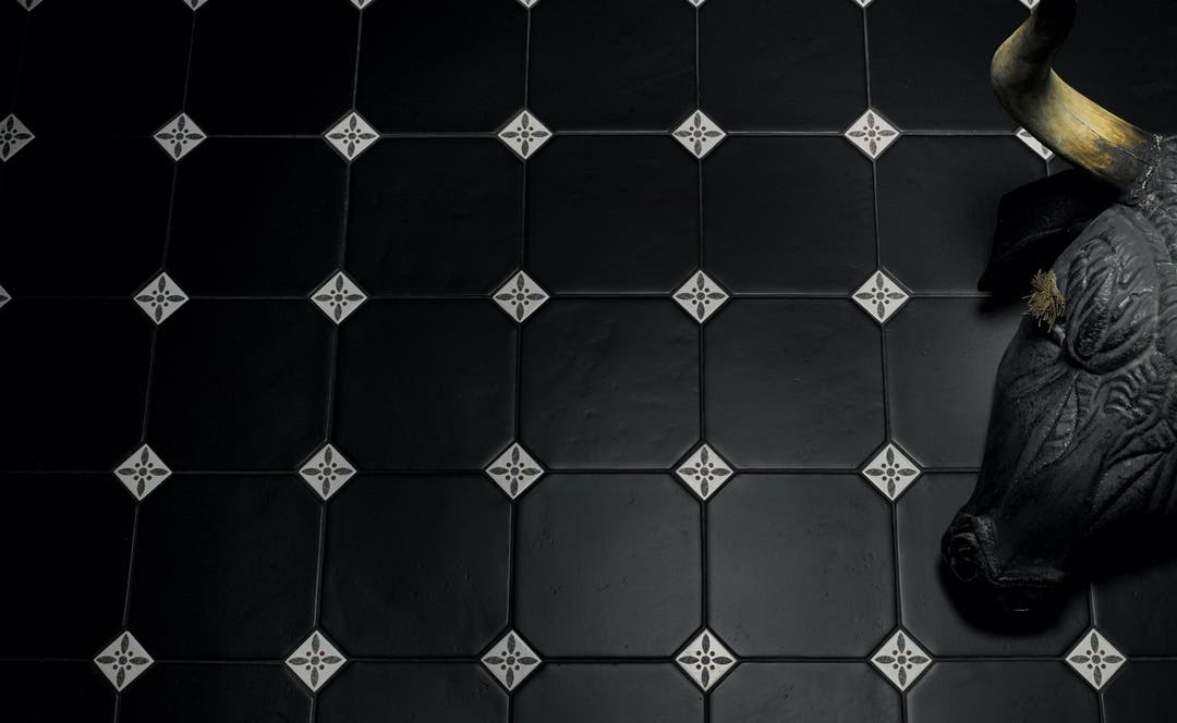 En svart tozett med dekorativ blomma som med fördel kompletteras med oktagonerna i samma serie. Ytan är matt och slät.