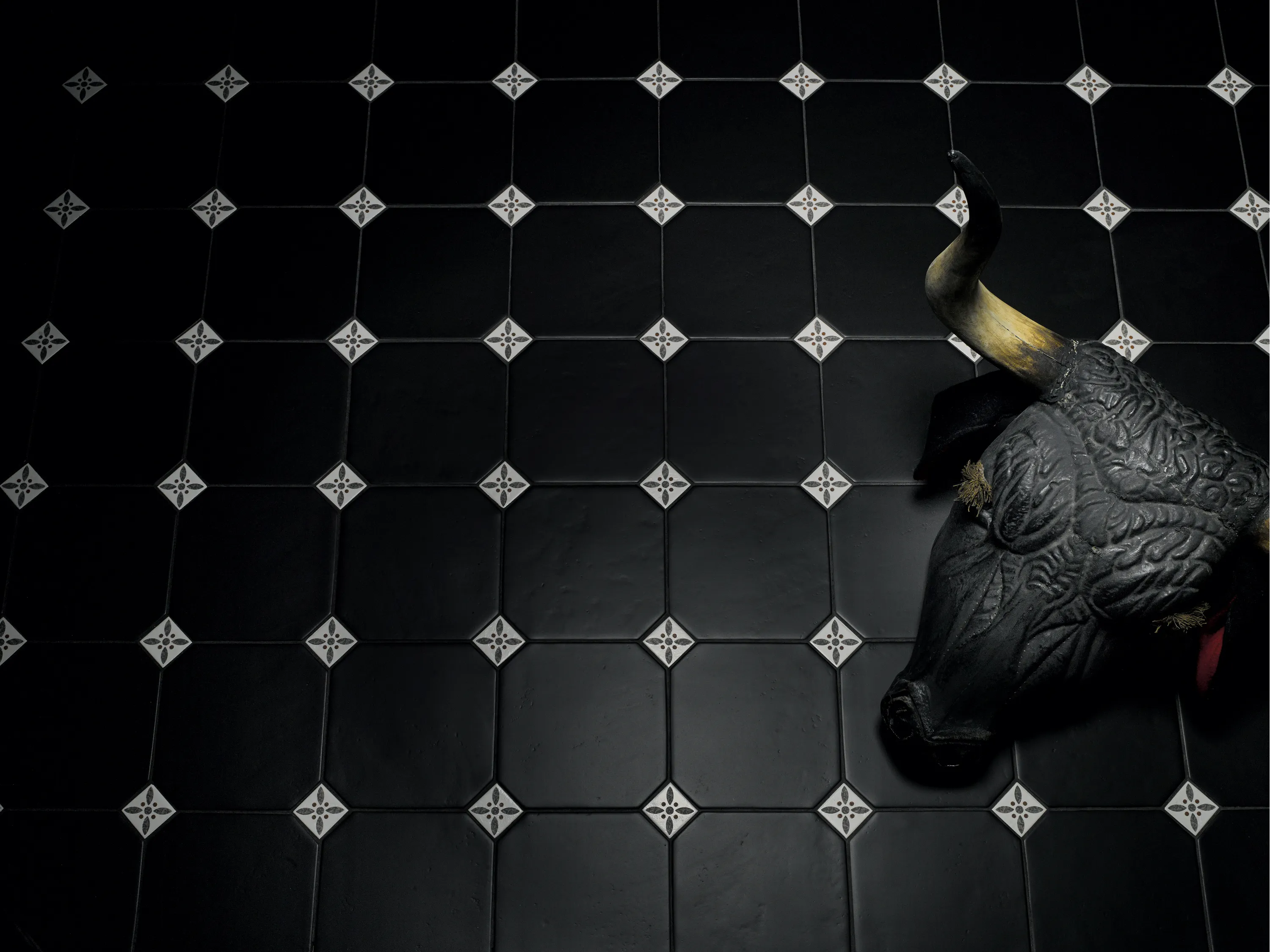 En vit tozett med dekorativ blomma som med fördel kompletteras med oktagonerna i samma serie. Ytan är matt och slät.